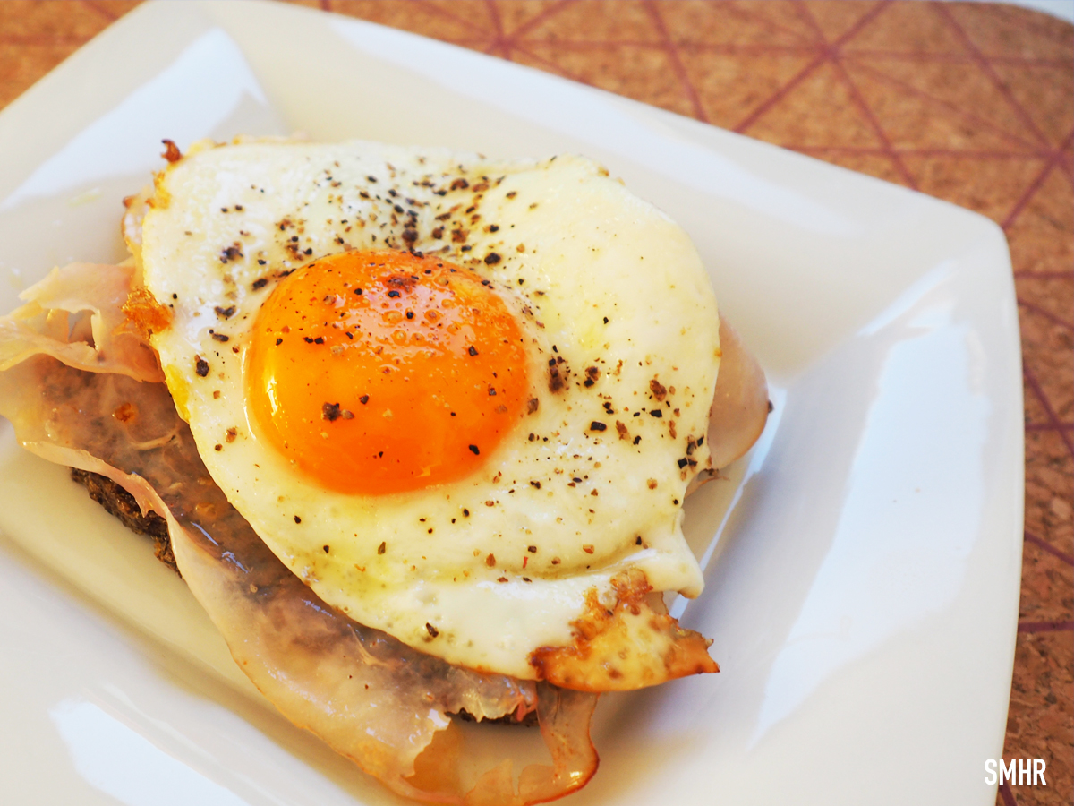 Für den „Strammer Max“ das Brot aufschneiden und eine Pfanne mit Öl bei geringer Hitze vorbereiten. Den Schinken anbraten und auf das Brot geben, genauso wie die fertigen Spiegeleier.