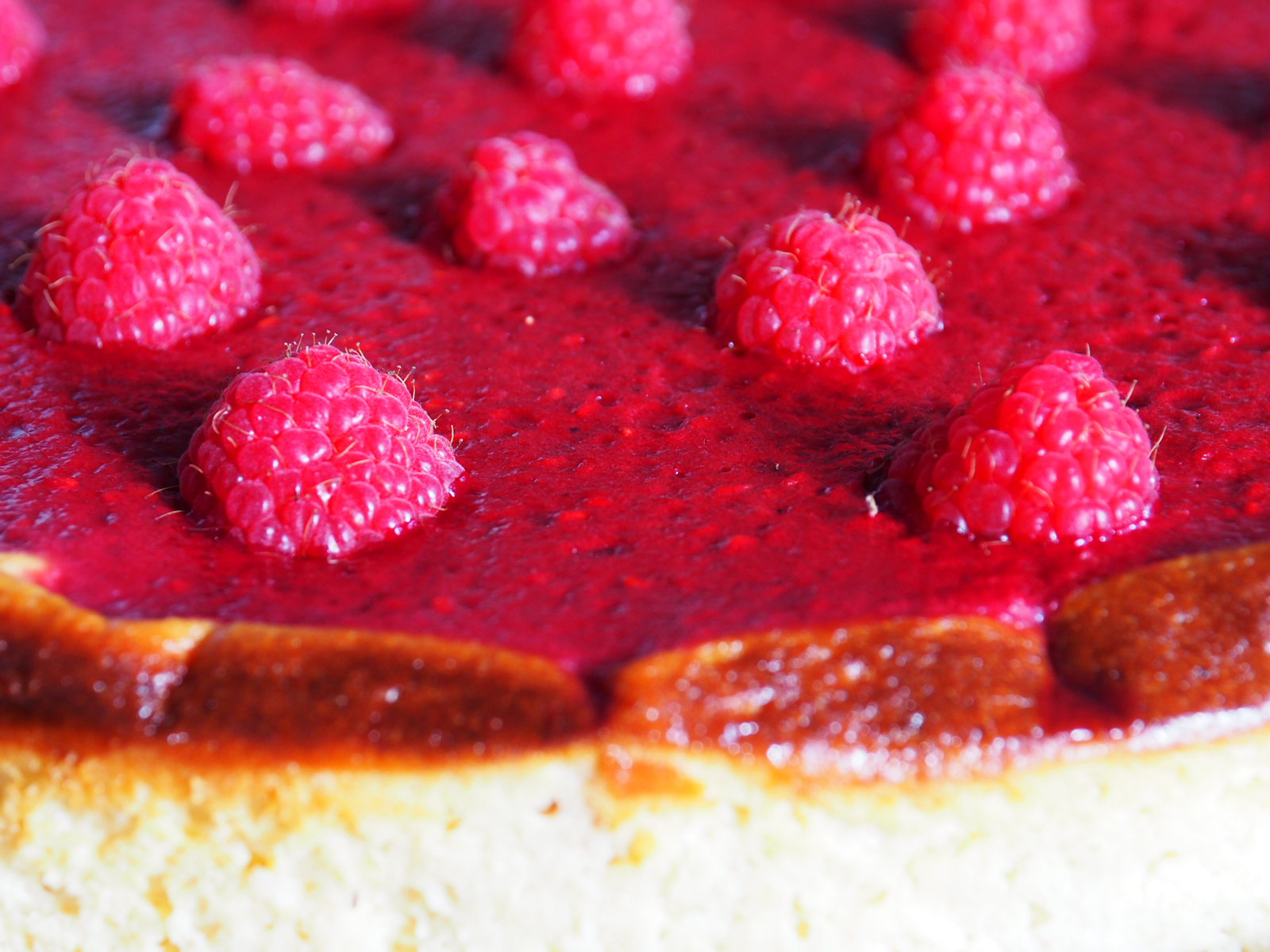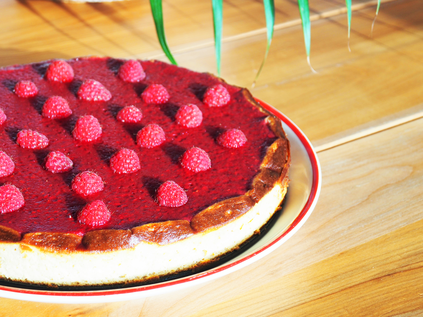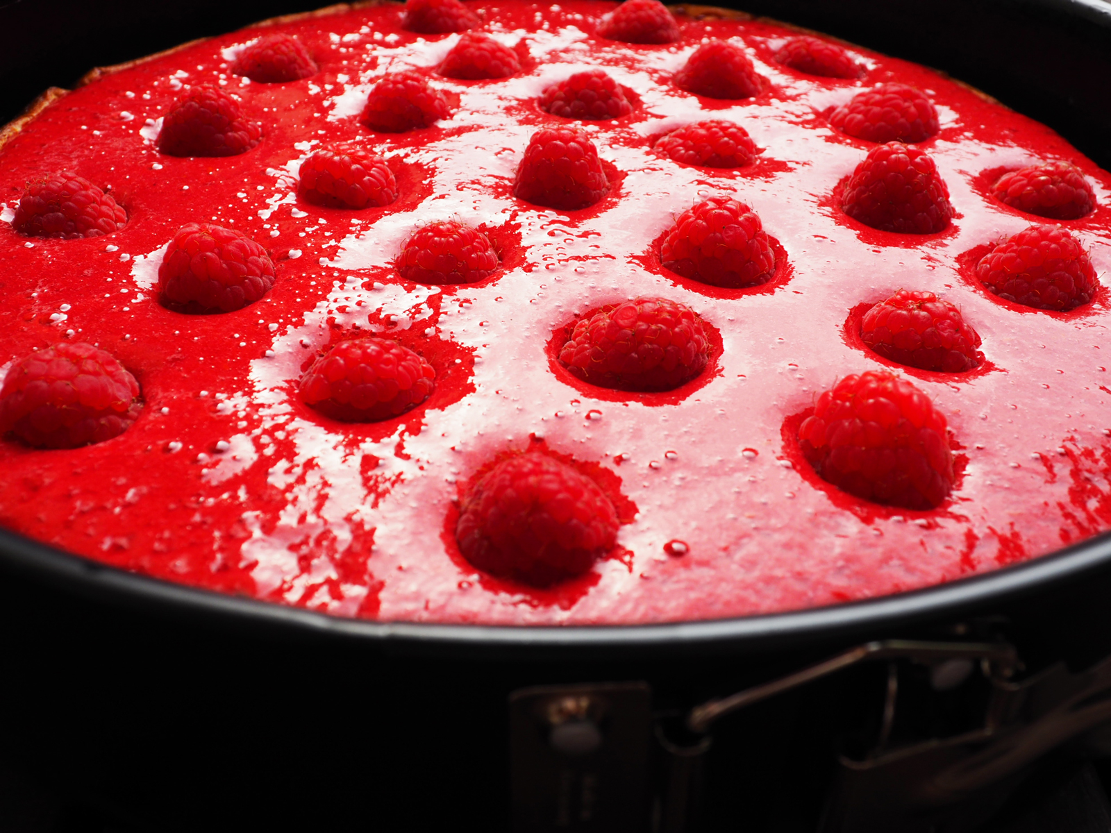Für das Topping drei Viertel der Himbeeren in den Mixer geben mit dem Saft einer halben Zitrone und etwas Süße (1-2 EL Honig) pürieren. In der Zwischenzeit die 6 Blatt Gelatine in 5 min in etwas Wasser aufweichen und anschließend abgetropft auf dem Herd erhitzen. Die flüssige Gelatine in die pürierte Masse geben und noch einmal gut mixen. Im Anschluss einfach auf den fertigen Käsekuchen geben und mit den restlichen Himbeeren dekorieren.